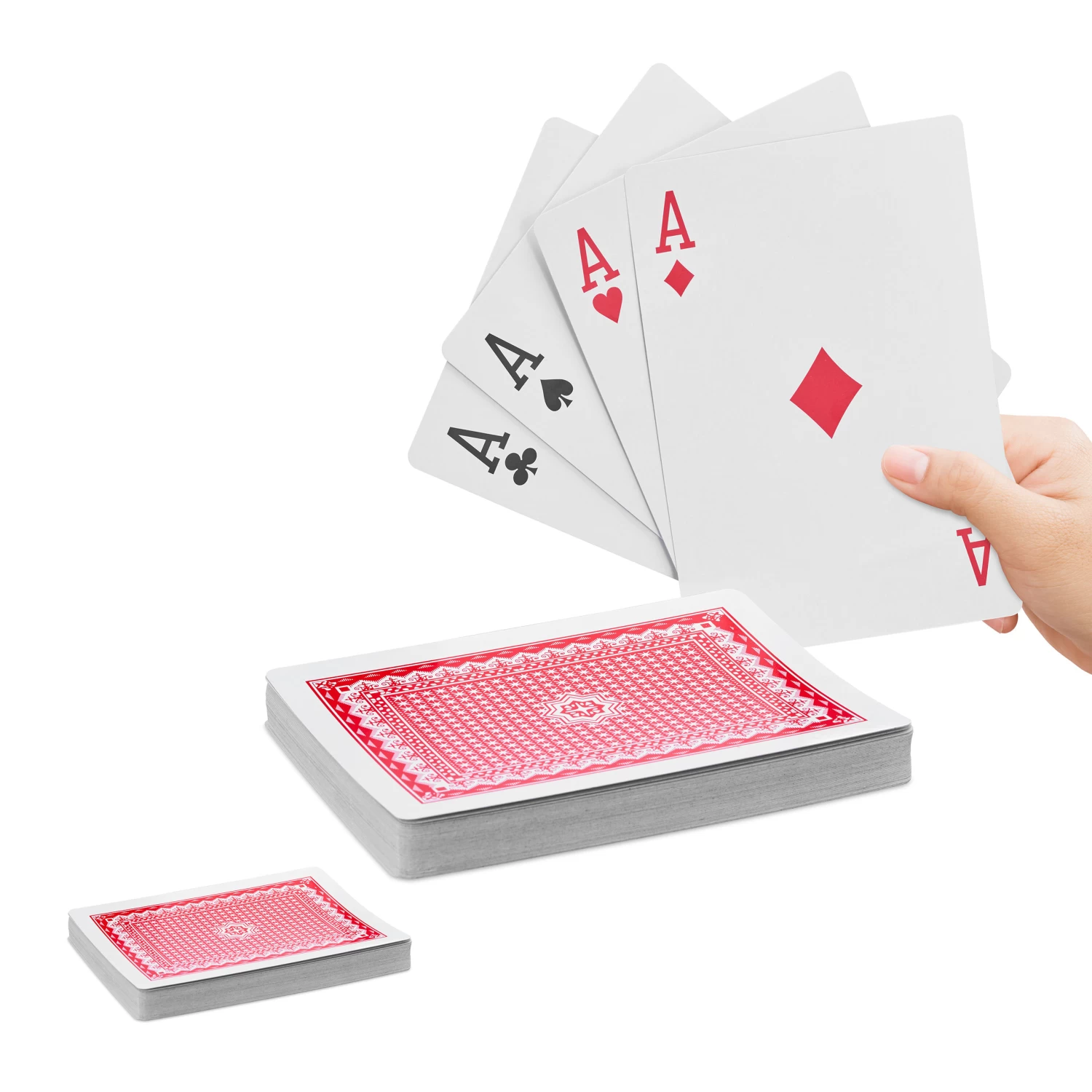 Maumau, Poker, Skat: Spannende und lustige Spiele. Allerdings ist es für Kinder schwer die Karten zu halten und für ältere Menschen, deren Sehkraft nachlässt, ist es manchmal schwierig die die Zahlen zu erkennen. Um dem Abhilfe zu leisten, gibt es die Jumbo Pokerkarten. Die Spielkarten sind aus Kunststoff gefertigt und damit langlebig und wasserabweisend. Perfekt für den Spielenachmittag mit Jung und Alt.