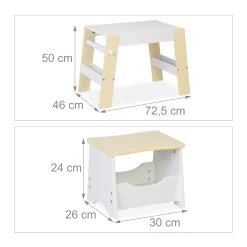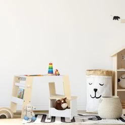 Dieses Kindermöbelset ist eine ideale Sitzgelegenheit für das Kinderzimmer. Es besteht aus einem großen Tisch und einem Hocker, welche keine scharfen Ecken aufweisen und somit für mehr Schutz sorgen. Deine Kleinen können dank der kindgerechten Höhe selbstständig an dem Spieltisch malen oder basteln sowie alleine auf dem Hocker Platz nehmen. Die zwei offenen Regale ermöglichen, dass das Spielzeug und die Bücher direkt griffbereit sind und anschließend wieder ordentlich verstaut werden können.