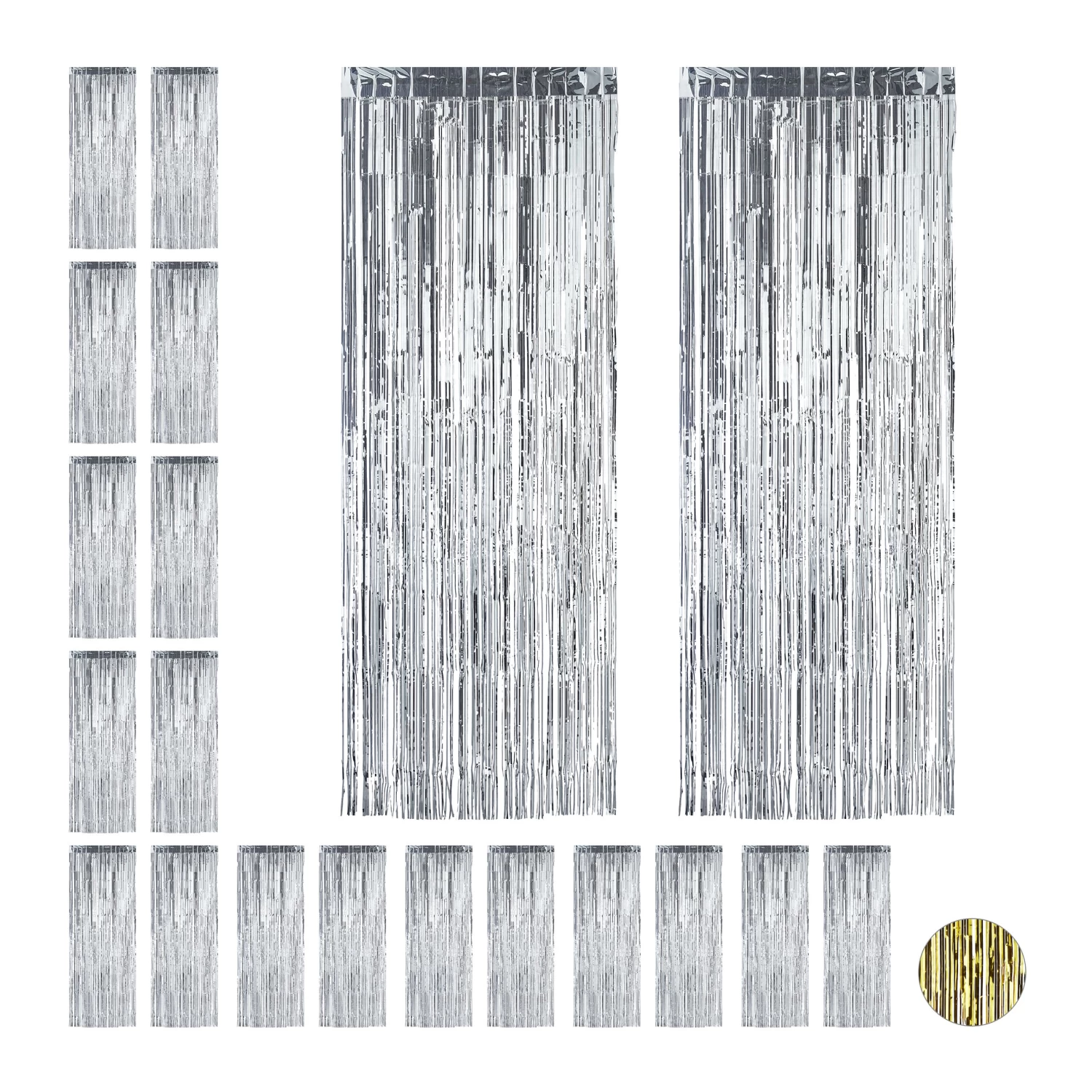 Sorgen Sie für glamouröse Atmosphäre mit diesen schimmernden Partyvorhängen! Die glitzernden Folienvorhänge im 20er Set werden über das doppelseitige Klebeband auf der Rückseite am Türrahmen oder der Wand befestigt und sorgen sofort für einen tollen Hingucker. Bei Bedarf können die Vorhänge einfach mit einer Schere in Länge und Breite gekürzt werden.