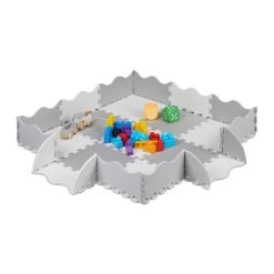 Spielspaß für die Kleinen garantiert die weiche Spielmatte zum Puzzeln. Der flexibel zusammensetzbare Puzzleteppich besteht aus 25 EVA-Schaumstoffmatten. Die pflegeleichte Krabbelmatte lässt sich einfach abwischen, besitzt eine stoßdämpfende Wirkung und ist zugleich eine wärmeisolierende Unterlage für das Spielen am Boden. Die Spielematte verfügt zudem über aufstellbare Randstücke, die den Spielbereich eingrenzen und einen festen Rahmen zum Austoben schaffen.