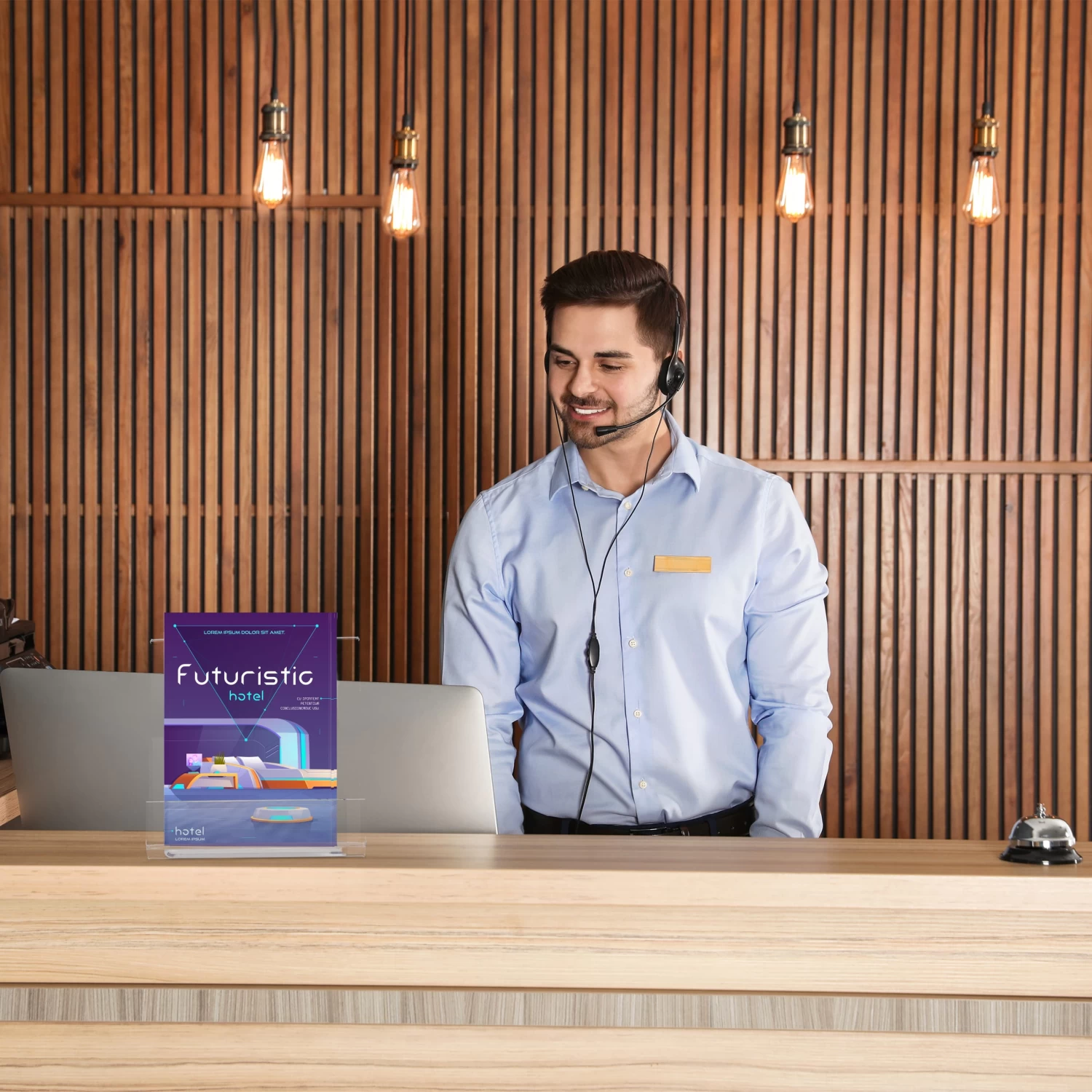 Der praktische Prospekthalter mit gebogener Kante ist auch für Werbemittel in Foyers von Hotel und Restaurant geeignet.