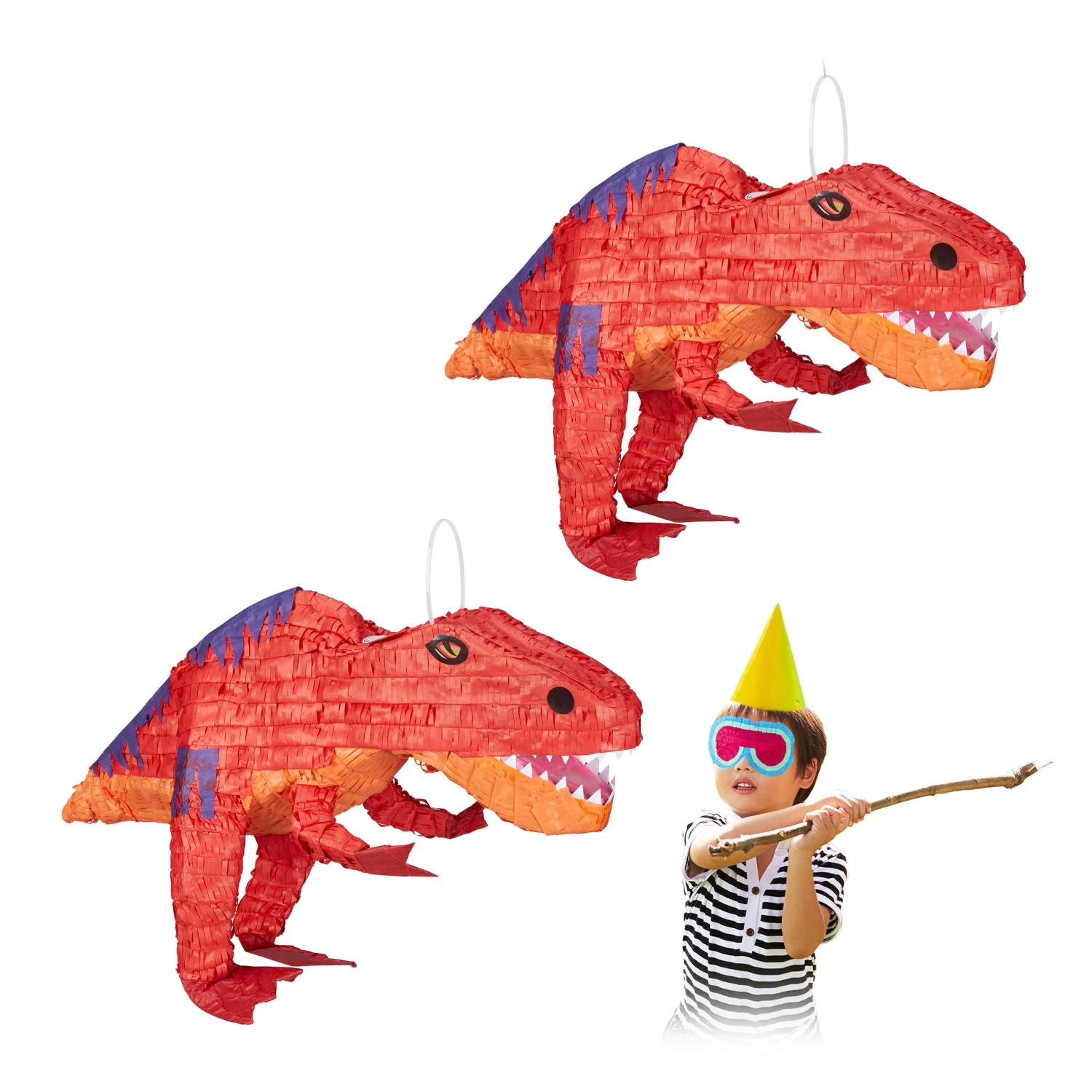 Mit dieser Dinosaurier Pinata sorgen Sie im Handumdrehen für gute Stimmung auf dem nächsten Kindergeburtstag. Der rote Tyrannosaurus kann mit Süßigkeiten, Spielzeug, Geschenken oder Konfetti befüllt werden. Die Kinder schlagen dann abwechselnd mit verbundenen Augen mit einem Stock auf den Dino ein, bis er aufplatzt und die Überraschungen herausfallen. Je höher die Pinata gehangen wird, umso größer ist der Schwierigkeitsgrad. Als lustige Partydeko sorgt der T-Rex für einen tollen Blickfang.
