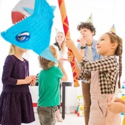 Mit dieser Haipinata sorgen Sie im Handumdrehen für gute Stimmung auf dem nächsten Kindergeburtstag. Die Party-Pinata kann mit Süßigkeiten, Spielzeug oder Konfetti befüllt werden. Die Kinder schlagen dann abwechselnd mit verbundenen Augen mit einem Stock auf den Haifisch ein, bis er aufplatzt und die Überraschungen herausfallen. Je höher die Pinata gehangen wird, umso größer ist der Schwierigkeitsgrad. Als lustige Partydeko sorgt der Hai für einen tollen Blickfang.