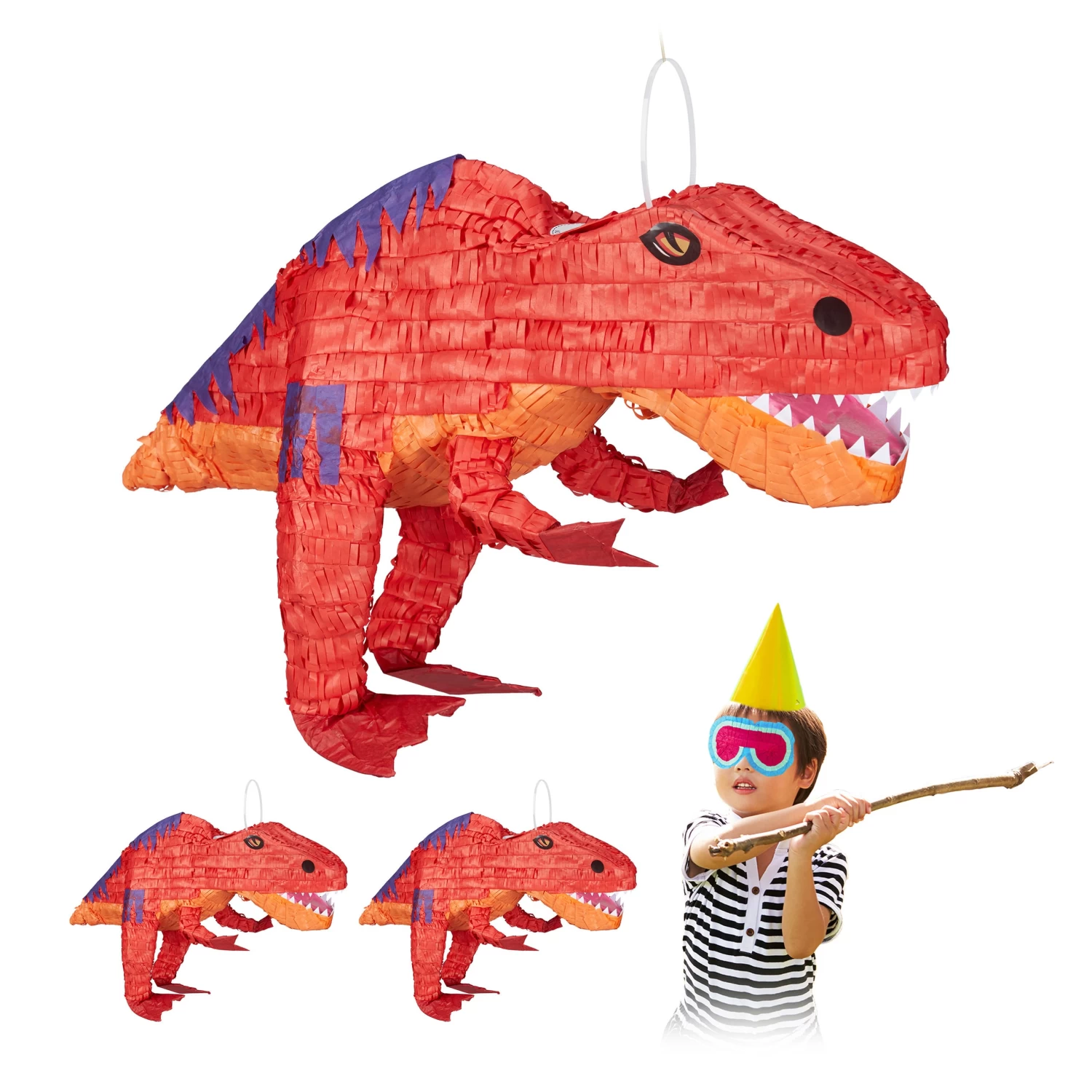 Mit dieser Dinosaurier Pinata sorgen Sie im Handumdrehen für gute Stimmung auf dem nächsten Kindergeburtstag. Der rote Tyrannosaurus kann mit Süßigkeiten, Spielzeug, Geschenken oder Konfetti befüllt werden. Die Kinder schlagen dann abwechselnd mit verbundenen Augen mit einem Stock auf den Dino ein, bis er aufplatzt und die Überraschungen herausfallen. Je höher die Pinata gehangen wird, umso größer ist der Schwierigkeitsgrad. Als lustige Partydeko sorgt der T-Rex für einen tollen Blickfang.