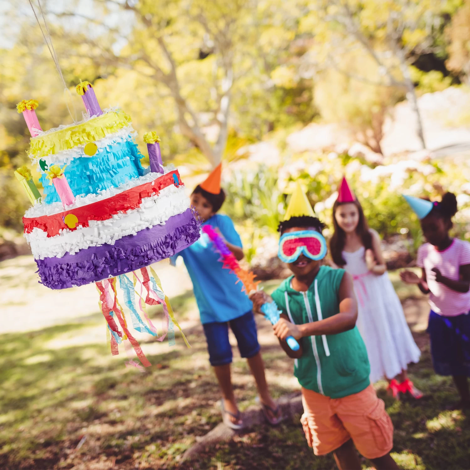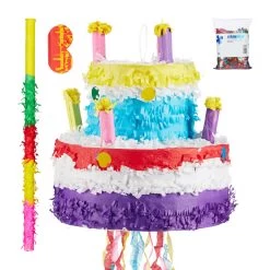 Mit dieser Torten Pinata sorgen Sie im Handumdrehen für gute Stimmung auf dem nächsten Kindergeburtstag. Befüllen Sie den bunten Kuchen mit dem mitgelieferten Konfetti und weiteren tollen Überraschungen wie Süßigkeiten, Spielzeug und kleinen Geschenken. Die Kinder schlagen dann abwechselnd mit verbundenen Augen mit dem Pinatastock auf die Pinata ein, bis sie aufplatzt und die Überraschungen herausfallen. Je höher die Pinata gehangen wird, umso größer ist der Schwierigkeitsgrad.
