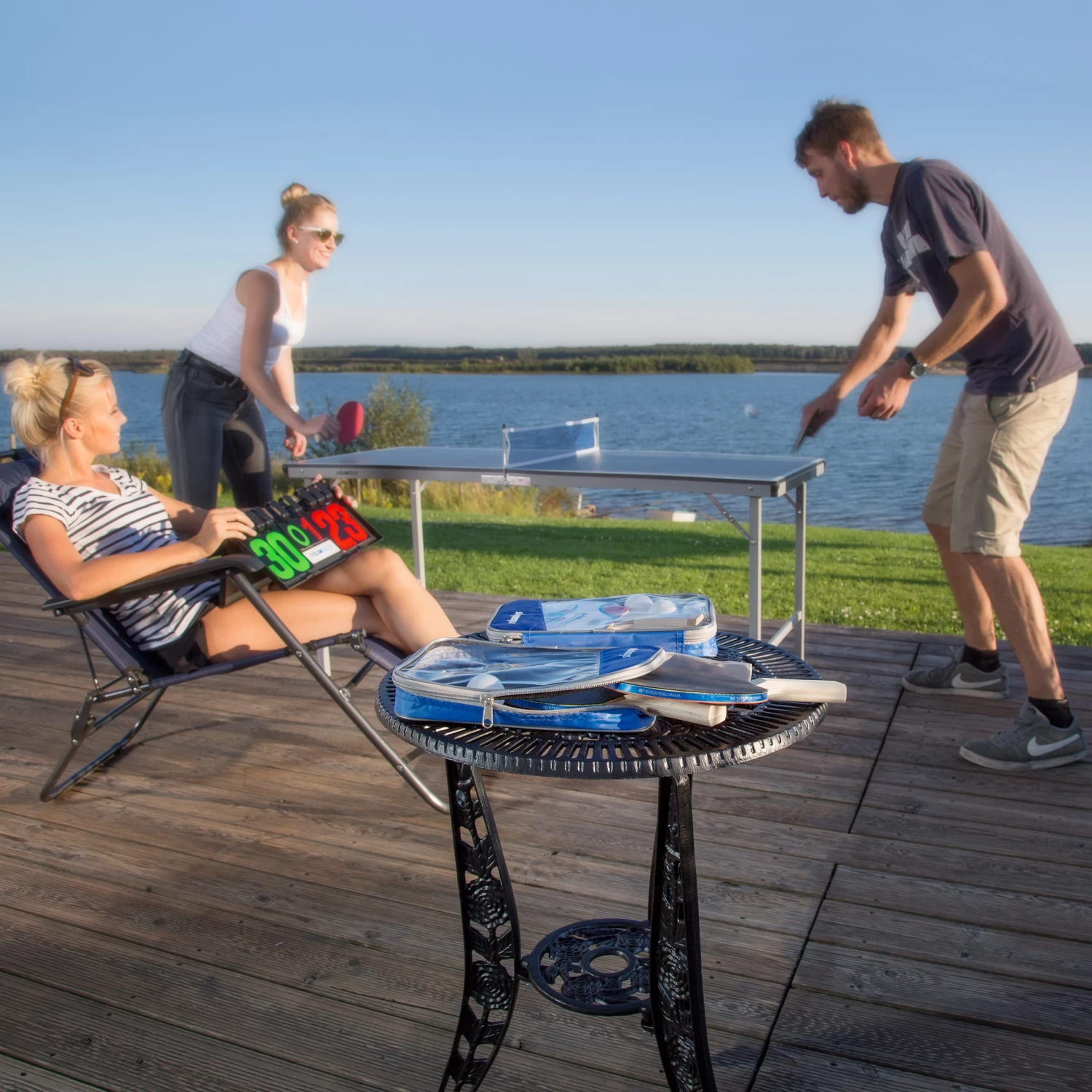 Das Tischtennis Set ist ideal für Hobbyspieler. Funktionieren Sie Ihren Tisch in eine Tischtennisplatte um oder nutzen Sie das Set unterwegs. Alle Teile sind handlich in einer praktischen Tragetasche verpackt. So lässt sich das Set überall mit hinnehmen und ist schnell aufgebaut. Es enthält 8 Schläger, 4 Netze mit Haltevorrichtung und 12 Bälle. Die Schläger bestehen aus Holz und sind mit einem rot-schwarzen Schaumgummi-Überzug versehen.