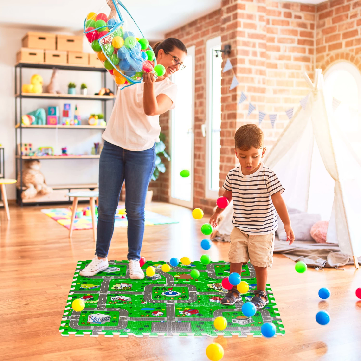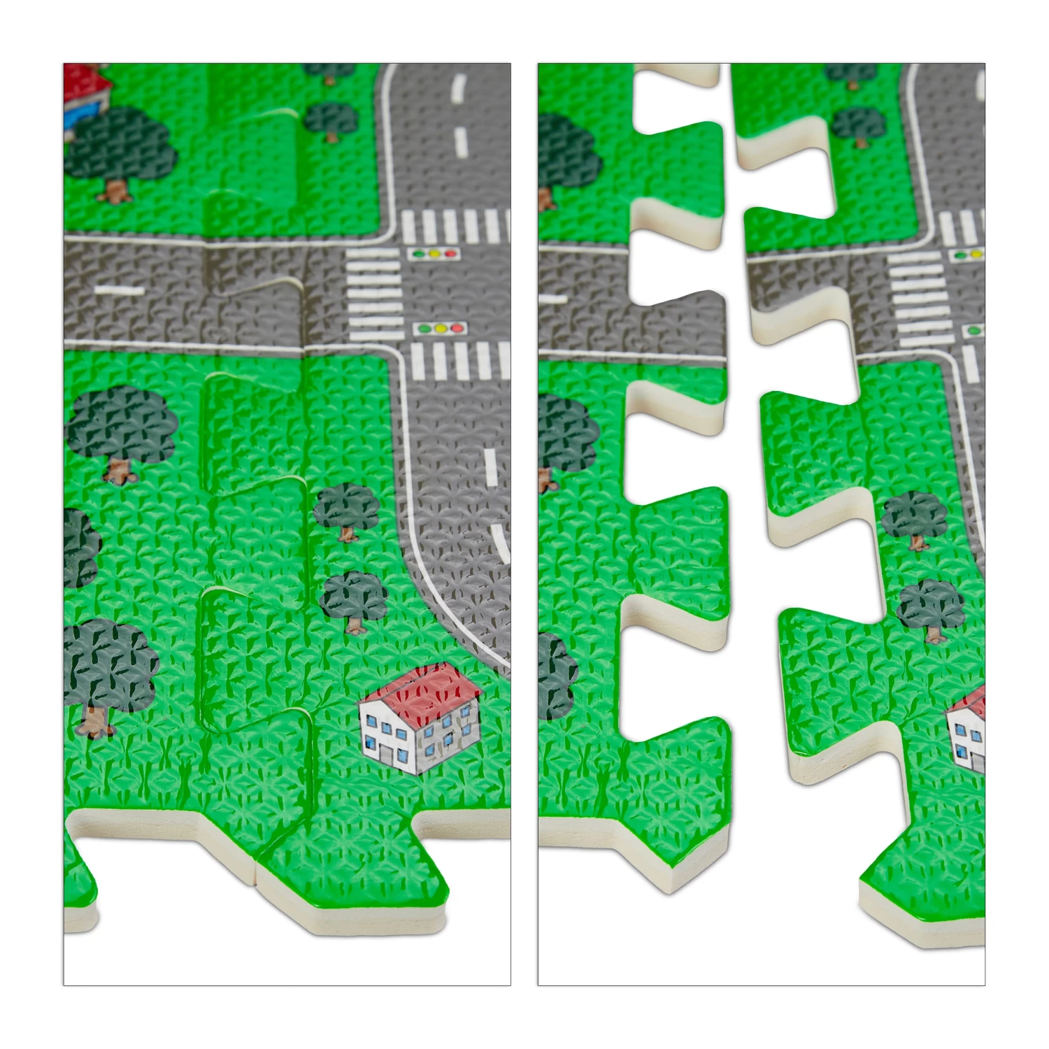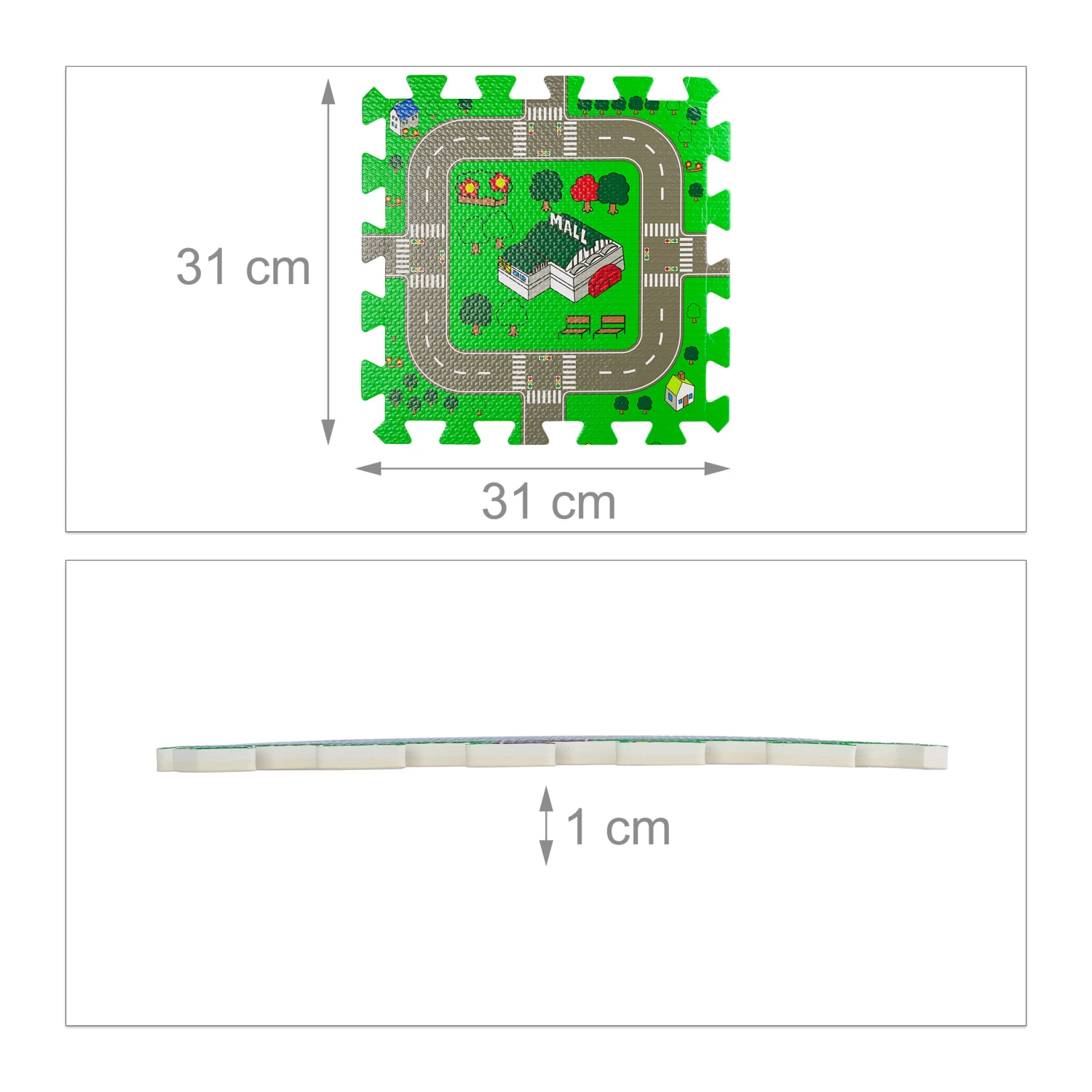 Spielspaß für die Kleinen garantiert der bunte Kinderspielteppich mit Straßen-Motiv zum Puzzeln. Die quadratische Babymatte besteht aus 9 EVA-Schaumstoffmatten, die zusammen ein farbenfrohes Stadt-Motiv bilden. Jede Matte hat ein eigenes Design mit Straße und Gebäude. Lassen Sie Ihr Kind eine eigene Stadt bauen und mit dem Spielzeugauto erkunden. Die pflegeleichte Krabbelmatte ist eine stoß- und schalldämpfende Unterlage für das Spielen am Boden.