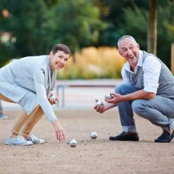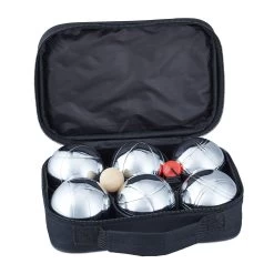 Dieses Bouleset ist ein tolles Outdoor-Spiel für die ganze Familie und bereitet im heimischen Garten ebenso viel Freude wie im Park oder am Strand. Das Boule-Spiel besteht aus 6 Metallkugeln, einer Zielkugel sowie einem Abstandsmesser und ist dank der praktischen Tragetasche auch ideal zum Mitnehmen auf Ausflüge oder in den Urlaub geeignet. Die handlichen Profi Boule Kugeln sind leicht zu Spielen und entsprechen in Größe und Gewicht gängigen Wettkampfkugeln. Dank der 3 unterschiedlichen Linienmuster lassen sich die Boccia Kugeln gut unterscheiden, sodass Sie zu zweit oder dritt spielen können und trotzdem genau wissen, welchem Spieler welche Kugeln gehören.