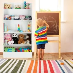 Für kleine Leseratten und Buchliebhaber ist dieses hübsche Bücherregal genau das Richtige. 4 geräumige Hängefächer aus buntem Stoff bieten nicht nur einen schönen Kontrast zu den weißen Seitenteilen, sondern schenken auch Büchern in allen Formen und Größen ausreichend Platz. Dank der kindgerechten Höhe kann Ihr kleiner Bücherwurm jederzeit selbstständig Bücher entnehmen und wieder einwerfen. Jedes Buch hat so seinen eigenen Platz und Ihr Kind seine Lieblingsbücher immer im Blick.