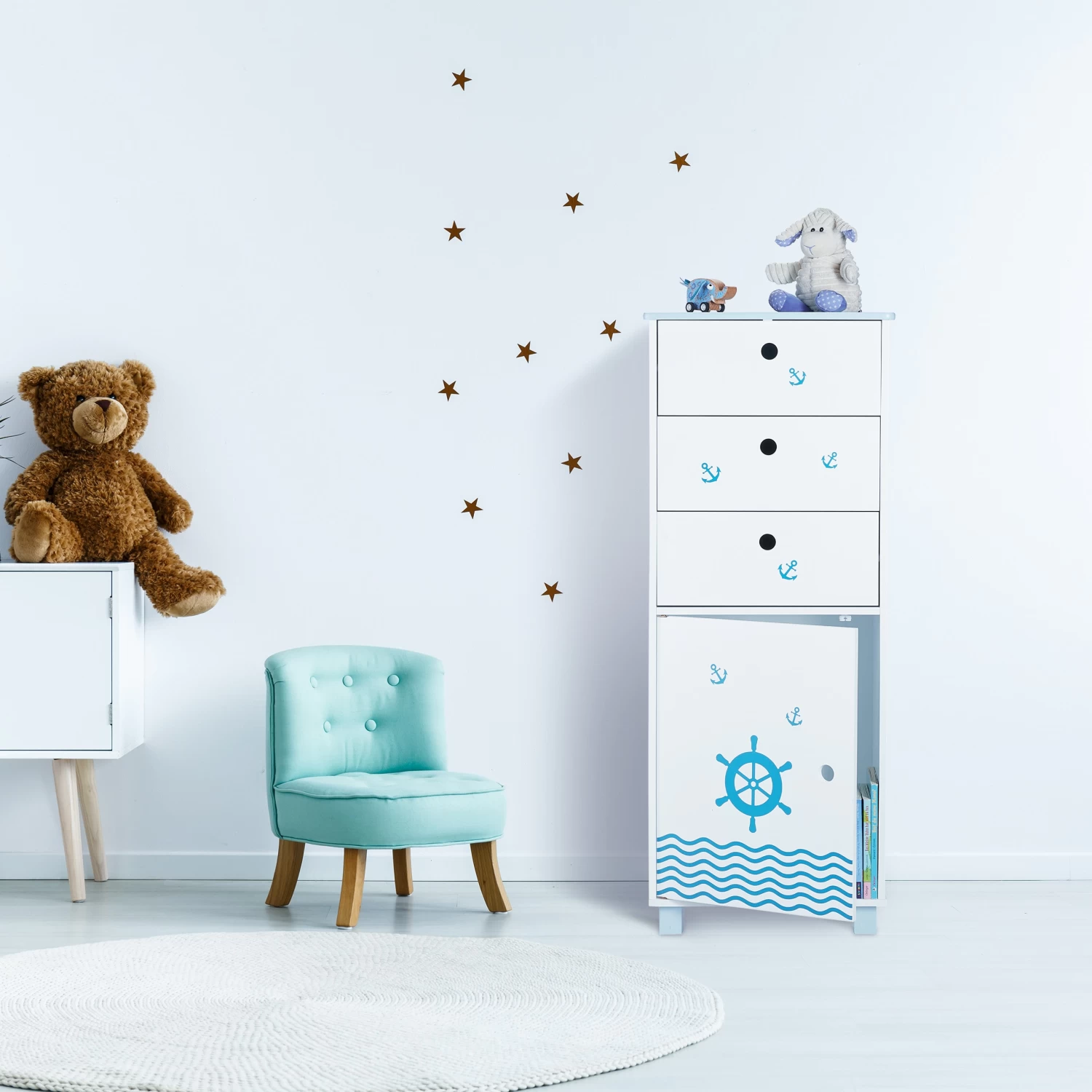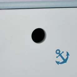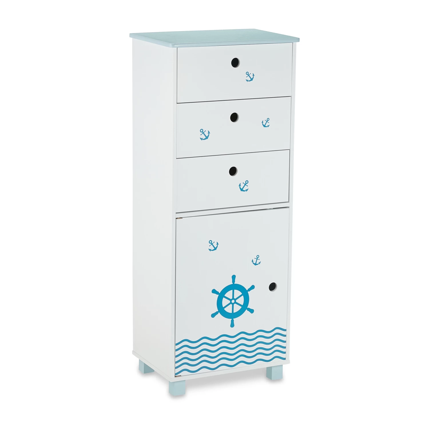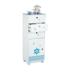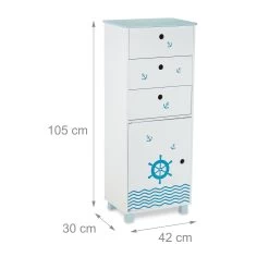 Diese schmale Kinderkommode passt perfekt ins Kinderzimmer und eignet sich bestens für ungenutzte Nischen. Für viel Stauraum sorgen die 3 Schubladen und das große Türfach des Kinderkommodenschranks. Durch seine abgerundeten Ecken und den Wandhaken ist der Schubladenschrank besonders sicher. Die kindgerechte Höhe macht ein selbständiges Ein- und Ausräumen problemlos möglich. Das coole Seefahrt-Design mit wogenden Wellen, Anker und Steuerrad begeistert alle Kinder.