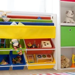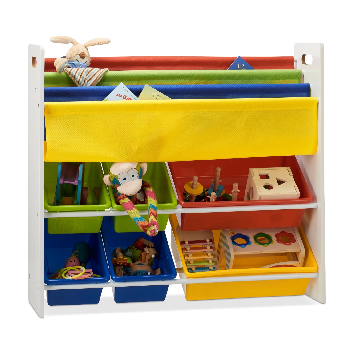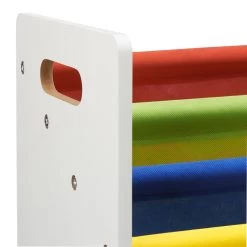 Von diesem bunten Kinderregal werden vor allem die Kleinsten begeistert sein. Besonderer Hingucker sind die fröhlichen, bunten Aufbewahrungsboxen und Stofffächern. In den Regalboxen können Kinder ihre Spielsachen schnell und ordentlich verstauen. Die Hängefächer sind ideal für die Lieblingsbücher Ihres kleinen Schatzes. Die Aufbewahrungseinheit überzeugt jedoch nicht nur durch ihr kindgerechtes Design. Auch die Handhabung ist speziell auf Kleinkinder ausgerichtet. Die Kisten und Fächer sind so angebracht, dass sie leicht zu erreichen sind. Dank der Griffe am Standegal platzieren Sie es jederzeit mühelos an Ihren Wunschort.
