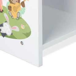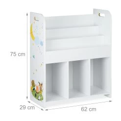 Mit diesem weißen Aufbewahrungsregal erfreuen Sie Ihre Kinder und sorgen für Ordnung in der Spielecke. In 3 Fächern haben Sie Stauraum für Bastelsachen, Puzzles, Spielzeugautos und vieles mehr. In den 3 oberen Ablagen finden dagegen Bücher ihren Platz. Dank der kindgerechten Höhe können bereits Kleinkinder das stabile Spielsachenregal selbstständig aus- und einräumen. Die niedlichen Motive an den Seiten bezaubern sowohl Mädchen als auch Jungen. Der Spielzeugschrank ist schnell aufgebaut.