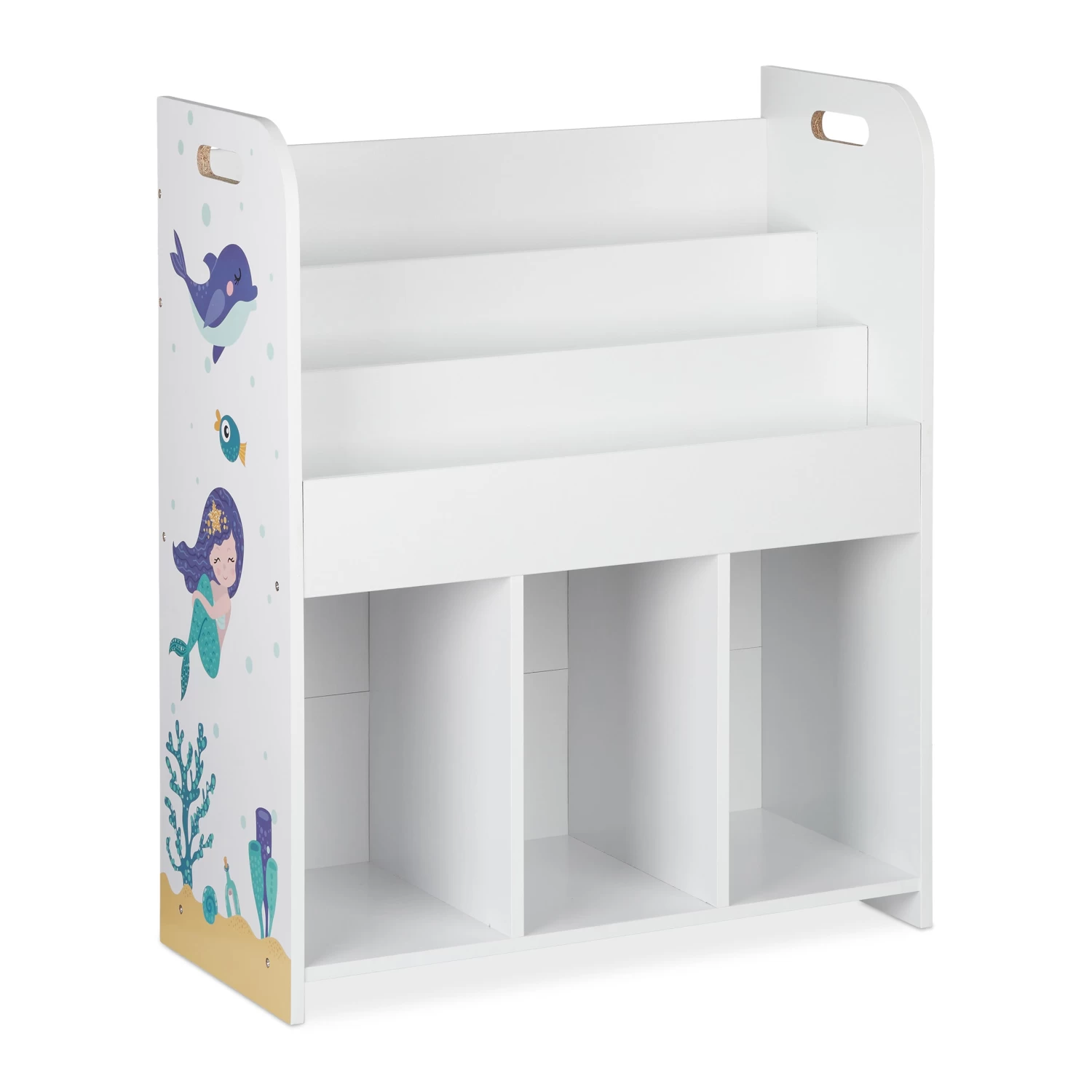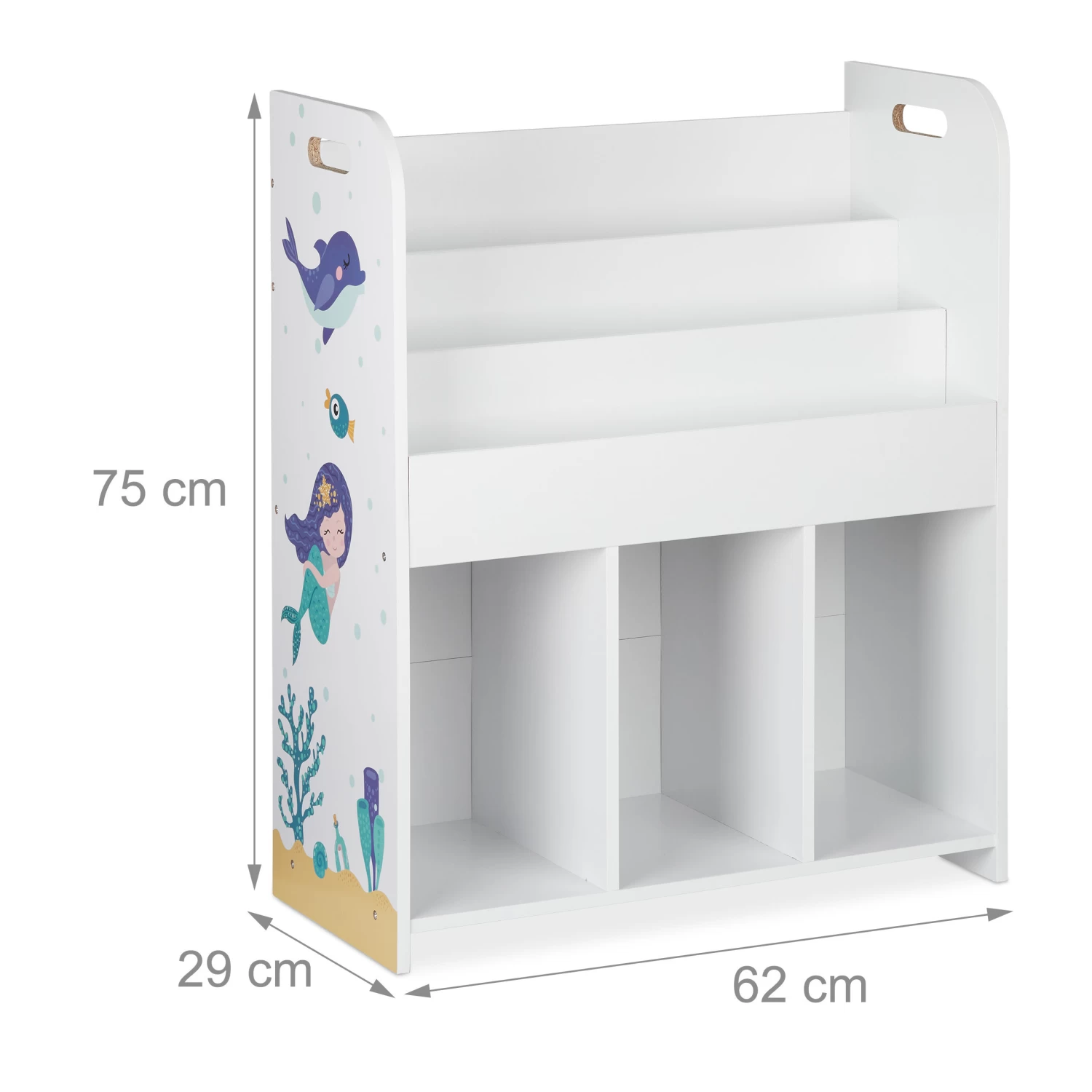 Mit diesem weißen Aufbewahrungsregal erfreuen Sie Ihre Kinder und sorgen für Ordnung in der Spielecke. In 3 Fächern haben Sie Stauraum für Bastelsachen, Puzzles, Spielzeugautos und vieles mehr. In den 3 oberen Ablagen finden dagegen Bücher ihren Platz. Dank der kindgerechten Höhe können bereits Kleinkinder das stabile Spielsachenregal selbstständig aus- und einräumen. Die niedlichen Motive an den Seiten bezaubern sowohl Mädchen als auch Jungen. Der Spielzeugschrank ist schnell aufgebaut.