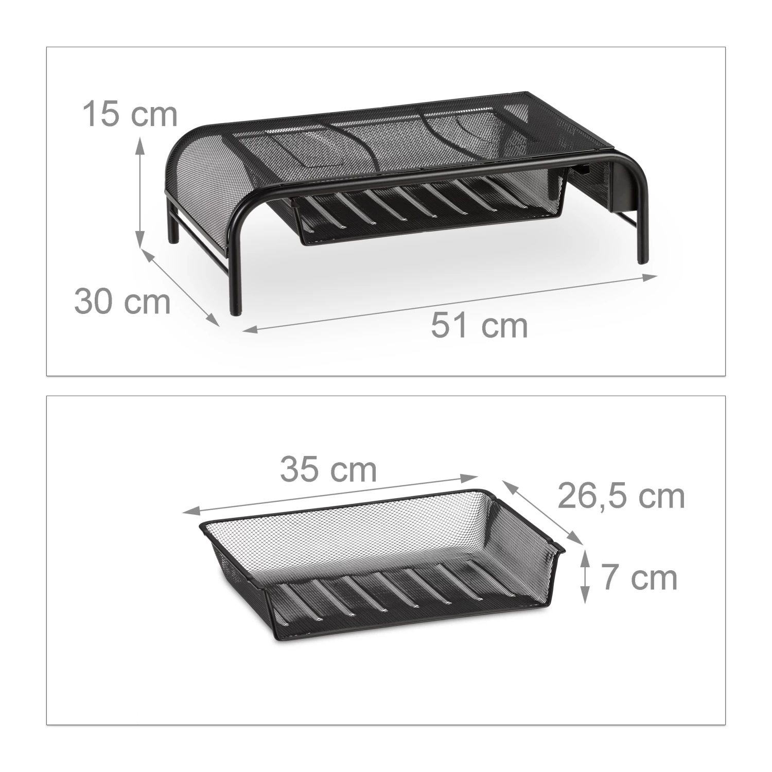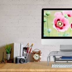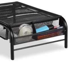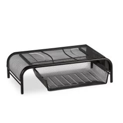 Mit dieser praktischen Monitorerhöhung kommt der Bildschirm auf Augenhöhe. Dies sorgt für eine aufrechtere Sitzhaltung und weniger Verspannung im Nacken. Gleichzeitig bietet dieser Tischaufsatz viel Platz zum Ordnen und Aufbewahren. In der Schublade finden wichtige Dokumente Platz und Utensilien wie Stifte, Schere oder Klebeband können in den zwei Seitenfächern untergebracht werden. Der Ständer eignet sich ebenfalls als Lapdesk, wenn Sie auf der Couch am Laptop arbeiten möchten. Daneben überzeugt der Monitor Tisch auch mit seiner modernen Gitteroptik.