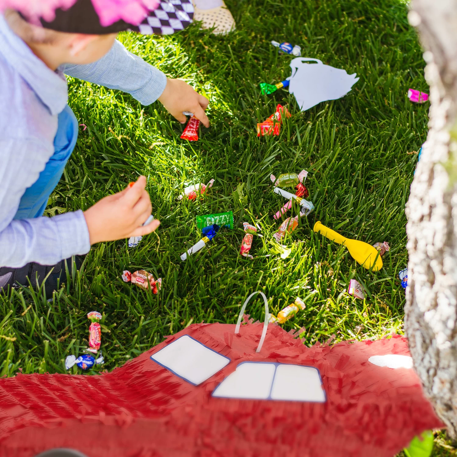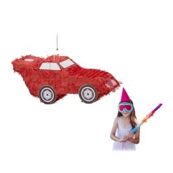 Mit dieser Auto Pinata sorgen Sie im Handumdrehen für gute Stimmung auf dem nächsten Kindergeburtstag. Das rote Rennauto kann mit Süßigkeiten, Spielzeug, kleinen Geschenken oder Konfetti befüllt werden. Die Kinder schlagen dann abwechselnd mit verbundenen Augen mit einem Stock auf die Pinata ein, bis sie aufplatzt und die Überraschungen herausfallen. Je höher die Pinata gehangen wird, umso größer ist der Schwierigkeitsgrad.