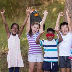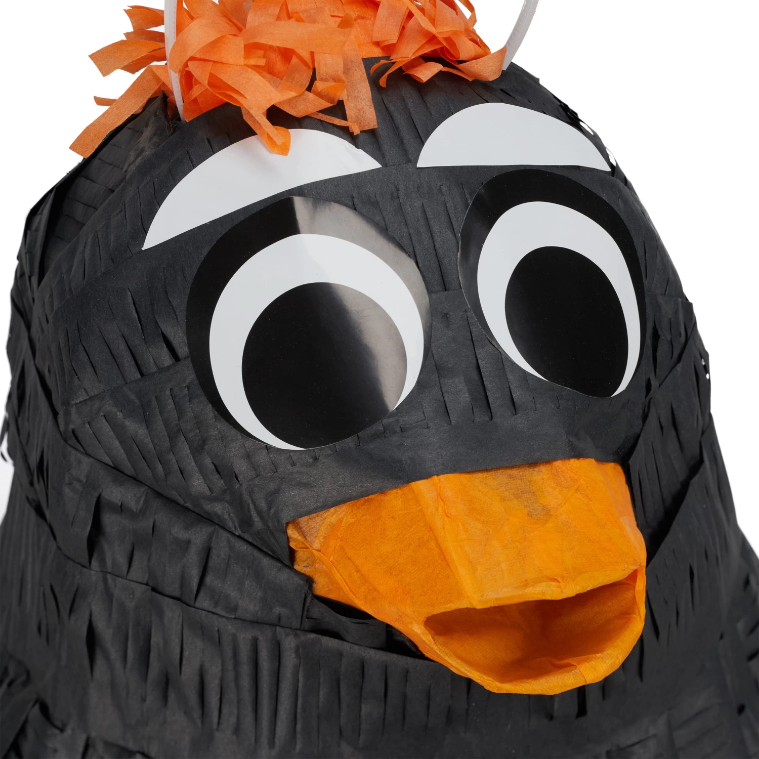Mit dieser Pinguin Pinata sorgen Sie im Handumdrehen für gute Stimmung auf dem nächsten Kindergeburtstag. Die Party-Pinata kann mit Süßigkeiten, Spielzeug oder Konfetti befüllt werden. Die Kinder schlagen dann abwechselnd mit verbundenen Augen mit einem Stock auf den Pinguin ein, bis er aufplatzt und die Überraschungen herausfallen. Je höher die Pinata gehangen wird, umso größer ist der Schwierigkeitsgrad. Als lustige Partydeko sorgt der Pinguin für einen tollen Blickfang.