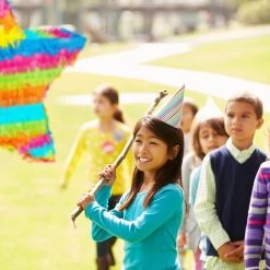 Mit dieser Stern Pinata sorgen Sie im Handumdrehen für gute Stimmung auf dem nächsten Kindergeburtstag. Das kunterbunte Sternchen kann mit Süßigkeiten, Spielzeug, kleinen Geschenken oder Konfetti befüllt werden. Die Kinder schlagen dann abwechselnd mit verbundenen Augen mit einem Stock auf die Pinata ein, bis sie aufplatzt und die Überraschungen herausfallen. Je höher die Pinata gehangen wird, umso größer ist der Schwierigkeitsgrad.