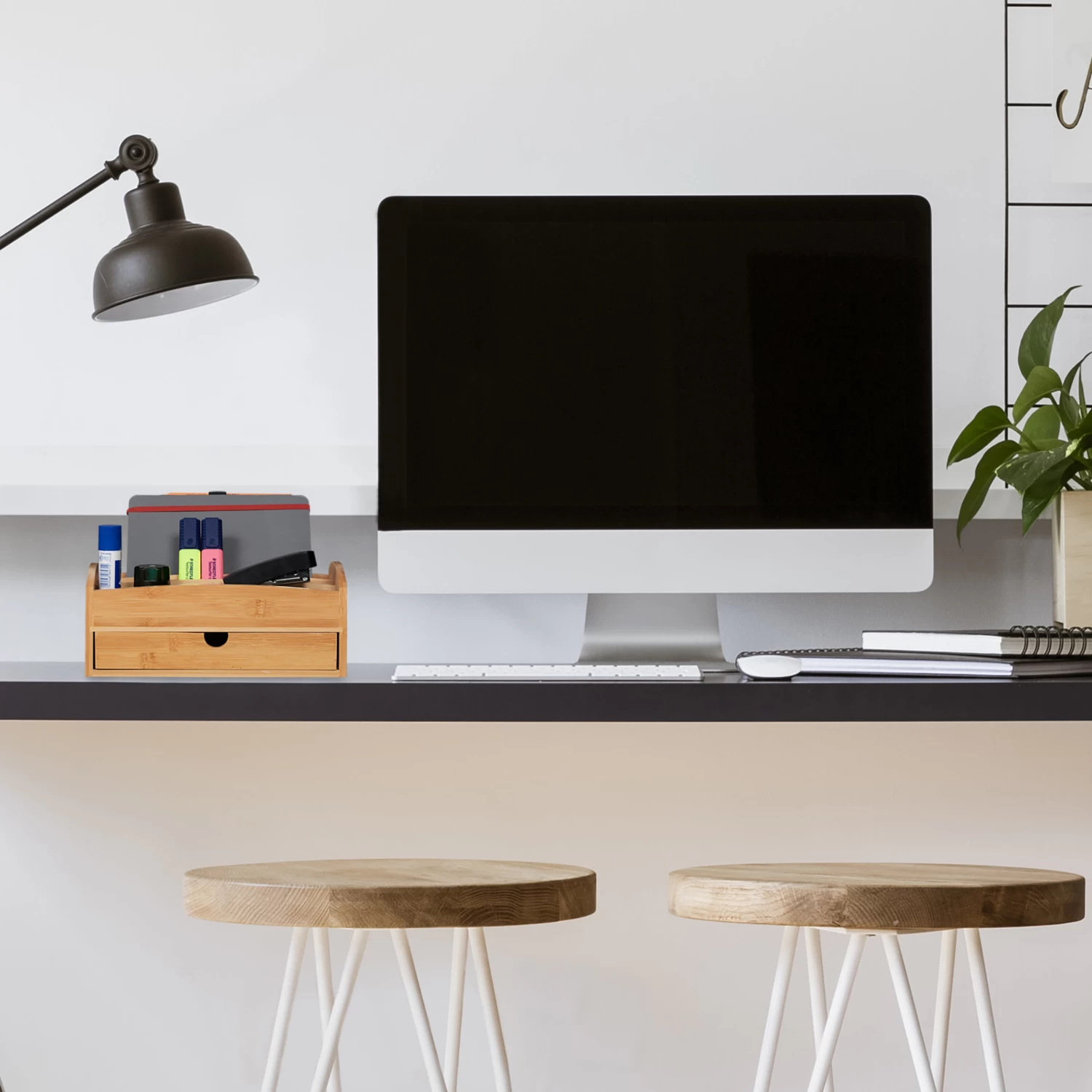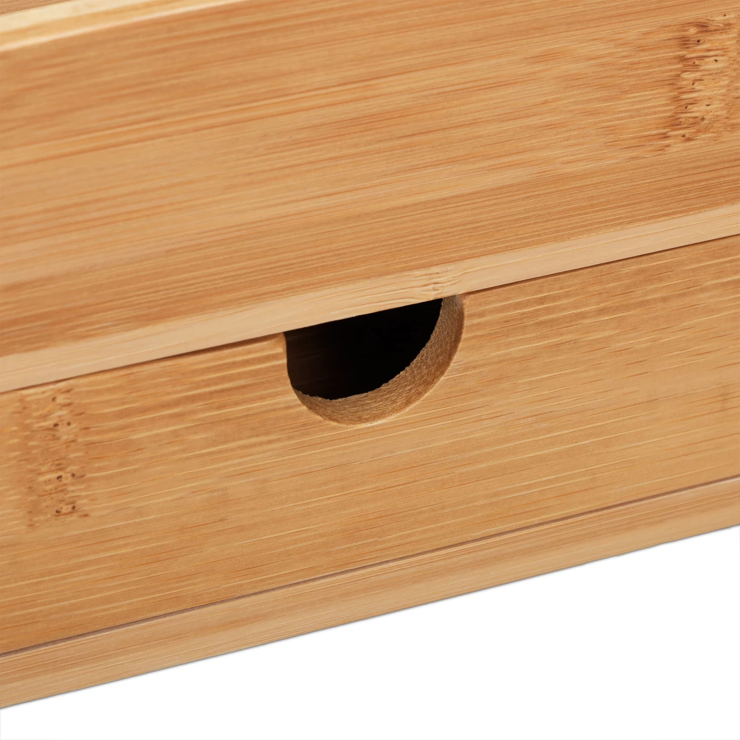 Zettel, Stifte und Kleinteile liegen überall auf Ihrem Schreibtisch herum? Dann ist dieser Bambus Organizer die Lösung für einen ungestörten Arbeitsablauf. Denn in dem Schreibtisch Organizer findet sich in 3 länglichen Fächern Platz für Ihre Stifte, Lineal, Büroklammern und weitere Utensilien. In der praktischen Schublade können Sie wichtige Zettel, Briefe und einiges mehr unterbringen. Auch als Bad Organizer für Ihren Schmuck ist dieser Tischorganizer perfekt geeignet.