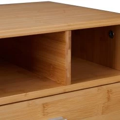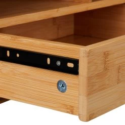 Dieser Bürotisch-Organizer sorgt für einen besseren Überblick auf Deinem Schreibtisch. Mit seinen 2 Fächern und der geräumigen Schublade bietet er viel Stauraum, um Schreibwaren oder Dokumente zu ordnen. Du kannst den Schreibtischbutler auch als Drucker-Organizer verwenden. Stelle einfach oben Deinen Drucker ab und nutze den Raum darunter sinnvoll für beispielsweise Ersatzpatronen. Die Schreibtischbox aus Bambus wirkt mit ihrer natürlichen Maserung sehr dekorativ im Büro oder Arbeitszimmer.
