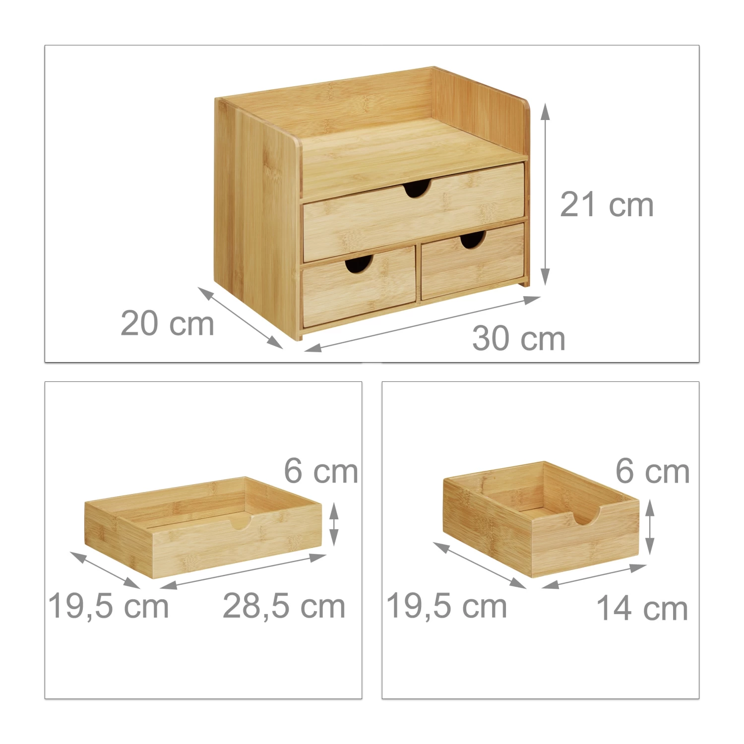 Die Büro-Aufbewahrungsbox mit Schubladen bietet nützlichen Stauraum, um Schreibutensilien und Briefe zu ordnen. Mit einem großen, geschlossenen Fach, zwei kleinen und der oberen Briefablage sind Sie bestens ausgerüstet, um die Ordnung auf Ihrem Schreibtisch zu bewahren und fokussiert zu arbeiten. Nicht nur als Büroablage, sondern auch im Jugendzimmer für Schularbeiten kann die Schubladenbox ein nützliches Tool sein, um Stifte, Büroklammern und andere Utensilien zu verstauen.