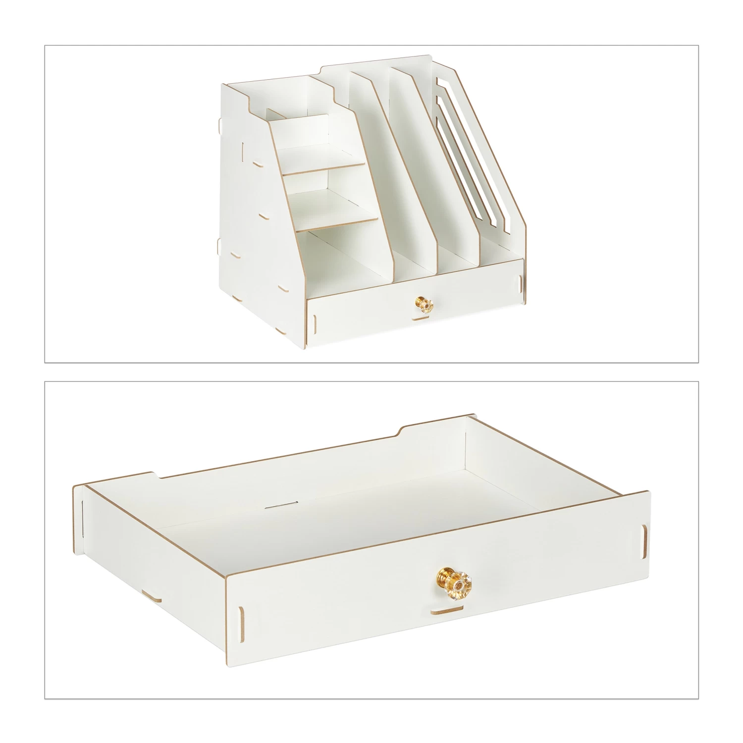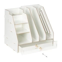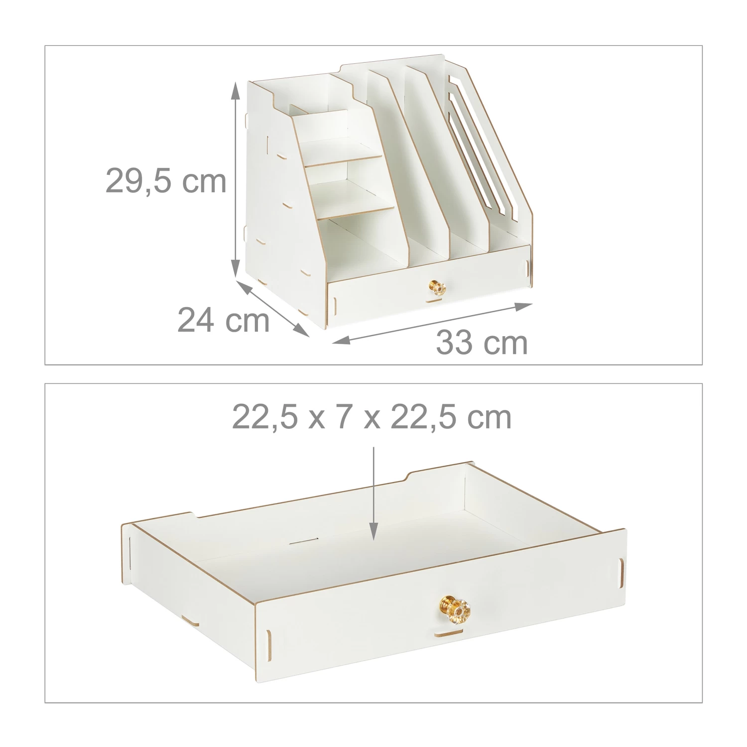 Mit dem DIY-Organizer sagst du dem Chaos auf dem Schreibtisch den Kampf an. Trotz leichter Bauweise bringt der Aktensammler das nötige Gewicht mit für einen stabilen, zuverlässigen Stand. In den 3 Schubern sortierst und verwahrst Du Dokumente, Zeitschriften, Blöcke oder Hefter im A4-Format übersichtlich und stets griffbereit. Die zusätzlichen Ablagen und Köcher bieten Platz für Stifte, Notizzettel uvm. Ein Schubfach bietet weiteren Stauraum, sodass alle Utensilien Platz im Büro-Organizer finden.