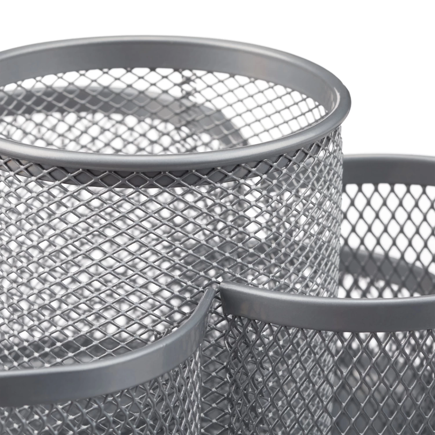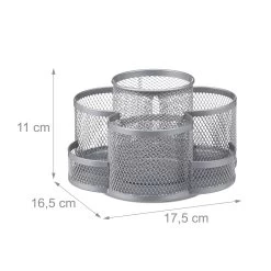 Chaos am Schreibtisch gehört ab sofort der Vergangenheit an. Durch den platzsparenden Stifteköcher wird Ihre Büroorganisation erleichtert und Ordnung am Schreibtisch geschaffen. Eine große Röhre, drei gleichgroße mittlere Röhren sowie drei weitere kleinere Ablagen bieten Platz für Kugelschreiber, Scheren, Lineale, Klebestifte oder auch Büroklammern. In den insgesamt sieben Fächern finden Ihre wichtigen Büromaterialien griffbereit Platz. Das praktische Metall-Design ist leicht zu reinigen und besitzt eine hohe Stabilität. Eine Drehfunktion sorgt dafür, dass Sie ein benötigtes Fach schnell in Ihre Richtung drehen können.