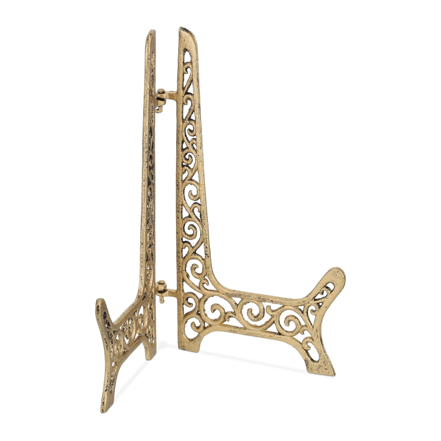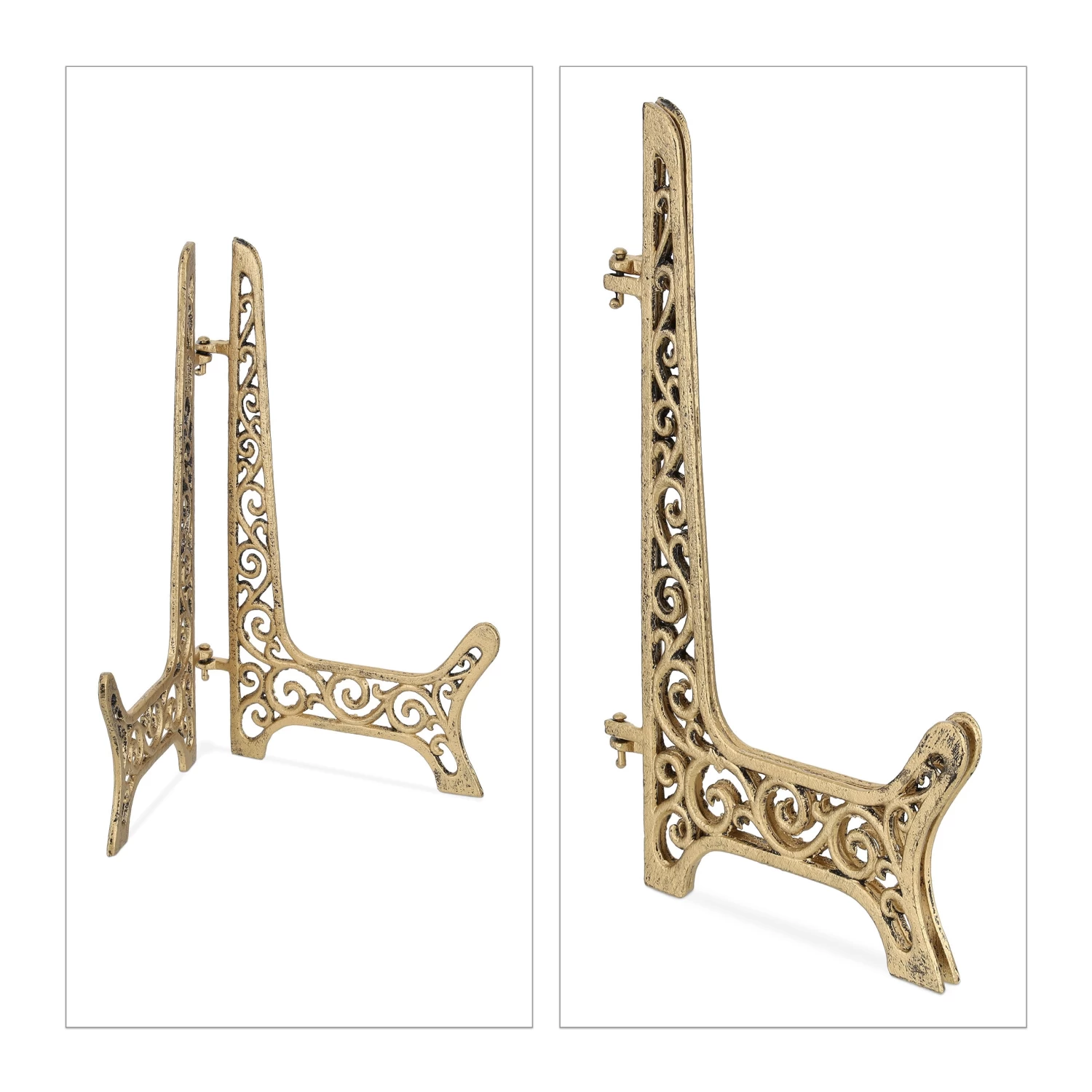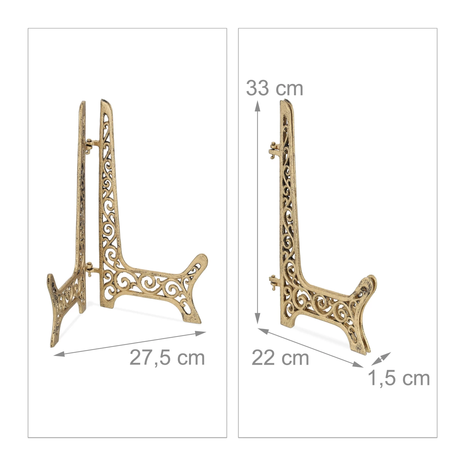 Mit diesem Fächerständer im verschnörkelten Design holst Du Dir antiken Charme nach Hause. Nutze die dekorative Tischstaffelei zum Abstellen von Leinwänden und kleinen Zeichenblöcken. Aber auch zum Präsentieren von Tellern, Bildern oder Speisekarten eignet sich der Metallständer ideal. Die Fertigung aus Gusseisen macht den Tellerhalter besonders robust, so dass er auch als Dekoelement im Garten genutzt werden kann.